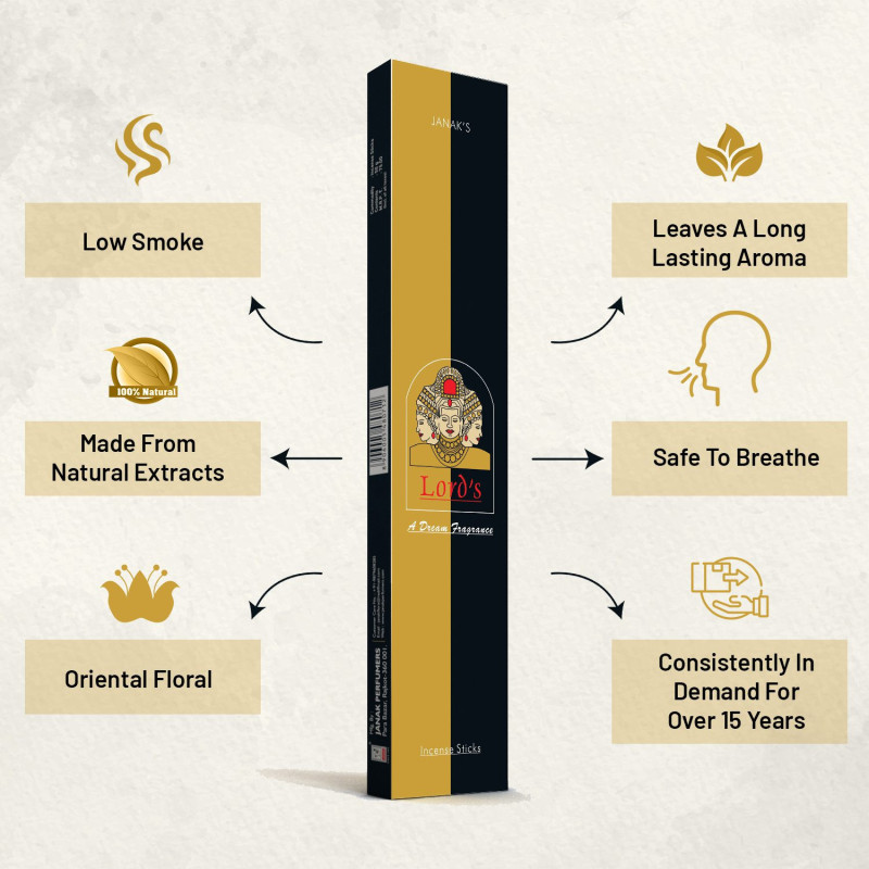 ith deep respect for ancient craftsmanship and eco-friendly practices, every pack is meticulously handmade to ensure quality and purityPremium Masala Agarbatti: 11-inch long sticks made with high-quality masala blend for deep, long-lasting fragrance.Rich & Divine Aroma: Special "Lords" fragrance crafted to invoke a spiritual and calming atmosphere. Ideal for Daily Use: Perfect for pooja, prayer rituals, meditation, yoga, and relaxation. Hand-Rolled in India: Made using traditional techniques with natural resins, essential oils, and herbal powders.