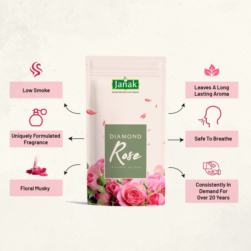 erfect for daily pooja, meditation, or simply refreshing your home environment, Janak Diamond Rose creates a divine and calming atmosphere. Its smooth, lingering fragrance adds a