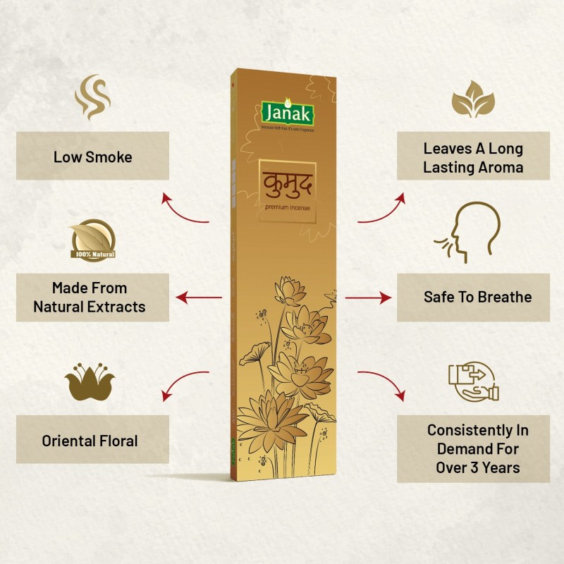 बेहद प्रीमियम कुमुद अगरबत्ती प्राकृतिक अर्क, मसाला अगरबत्ती लकड़ी का पाउडर, कम धुआं, लंबे समय तक चलने वाली अगरबत्ती। 25 छड़ियों का पैक कुमुद अगरबत्ती आदर्श रूप से धार्मिक उद्देश्यों, चिकित्सा और ध्यान के लिए उपयोग की जाती है। हमारी अगरबत्तियाँ हवा को ताज़ा करने और अवांछित गंध को बेअसर करने के लिए डिज़ाइन की गई हैं। यह चिकित्सा और ध्यान के लिए एक शांत वातावरण भी बनाता है। इसके अलावा, हमारी अगरबत्तियाँ घर और कार्यस्थल दोनों जगह सुखदायक आभा पैदा करने के लिए लंबे समय तक चलने वाली ताज़ा खुशबू छोड़ती हैं।